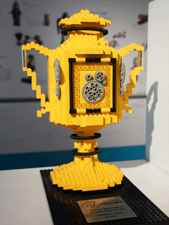 会場には、FLLの経緯や大会の様子、ロボット競技の作品、レゴで作られたトロフィーなどを展示。フリースペースでは年代を問わず自由に多数のレゴブロックで組み立て遊ぶことができ、11月に行われたワークショップで作られたレゴの動くおみこしも展示している。
